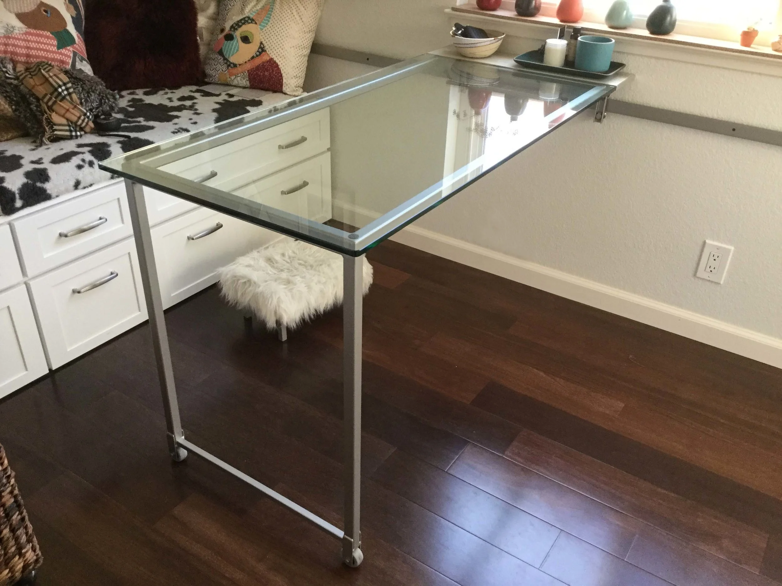 My original design had the 40lb glass top cantilevered out from the wall but the engineering was just too cumbersome. She compromised and allowed me to add legs so this is what I came up with. One end rolls along a rail bolted to the wall while the other is supported by a simple frame that rides on a pair of urethane wheels.