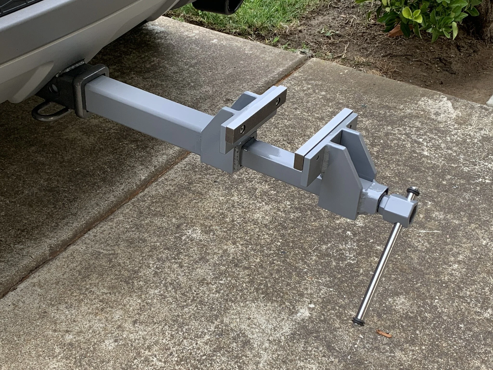 This project started with part of an old trailer hitch that I’d been saving. I figured that I could use it to build a large capacity vise that could be inserted into a trailer hitch. With a 20” body it can accommodate 17” of material. By using nesting tubes, the dynamic jaw can remain solid as it slides uninterrupted through the static body. The design uses an internal tube with a couple nuts welded to the forward end which allows the lead screw to essentially draw from the rear of the vise versus the midpoint. The design was basically dictated by the pieces of scrap steel that I tend to collect from my local steel mill.